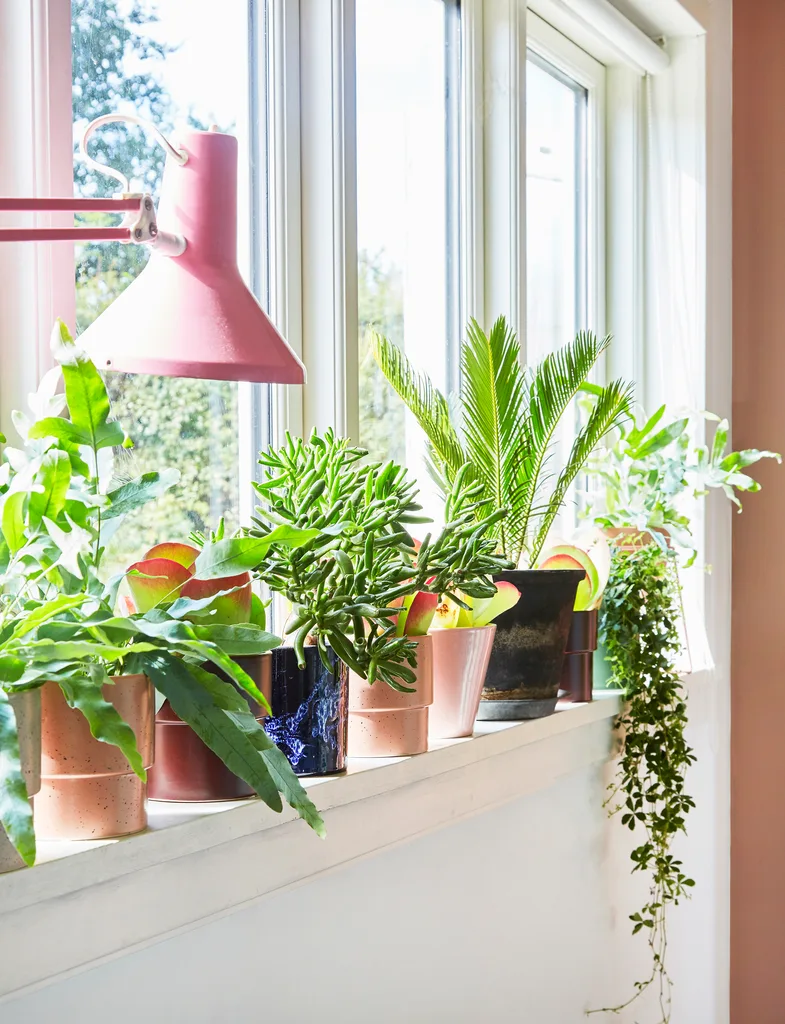 If you’re renting or don’t have any shelving suitable for plant display, think outside the frame and press your windowsill into service. Line your sun-loving plants along its edge and they’ll thank you for the availability of light with bumper growth.
