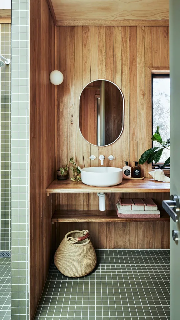 This lavish bathroom in Victoria’s Mornington Peninsula echoes its coastal surrounds with natural materials and colours.